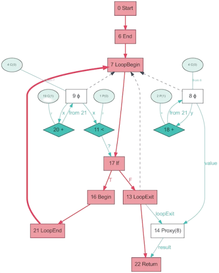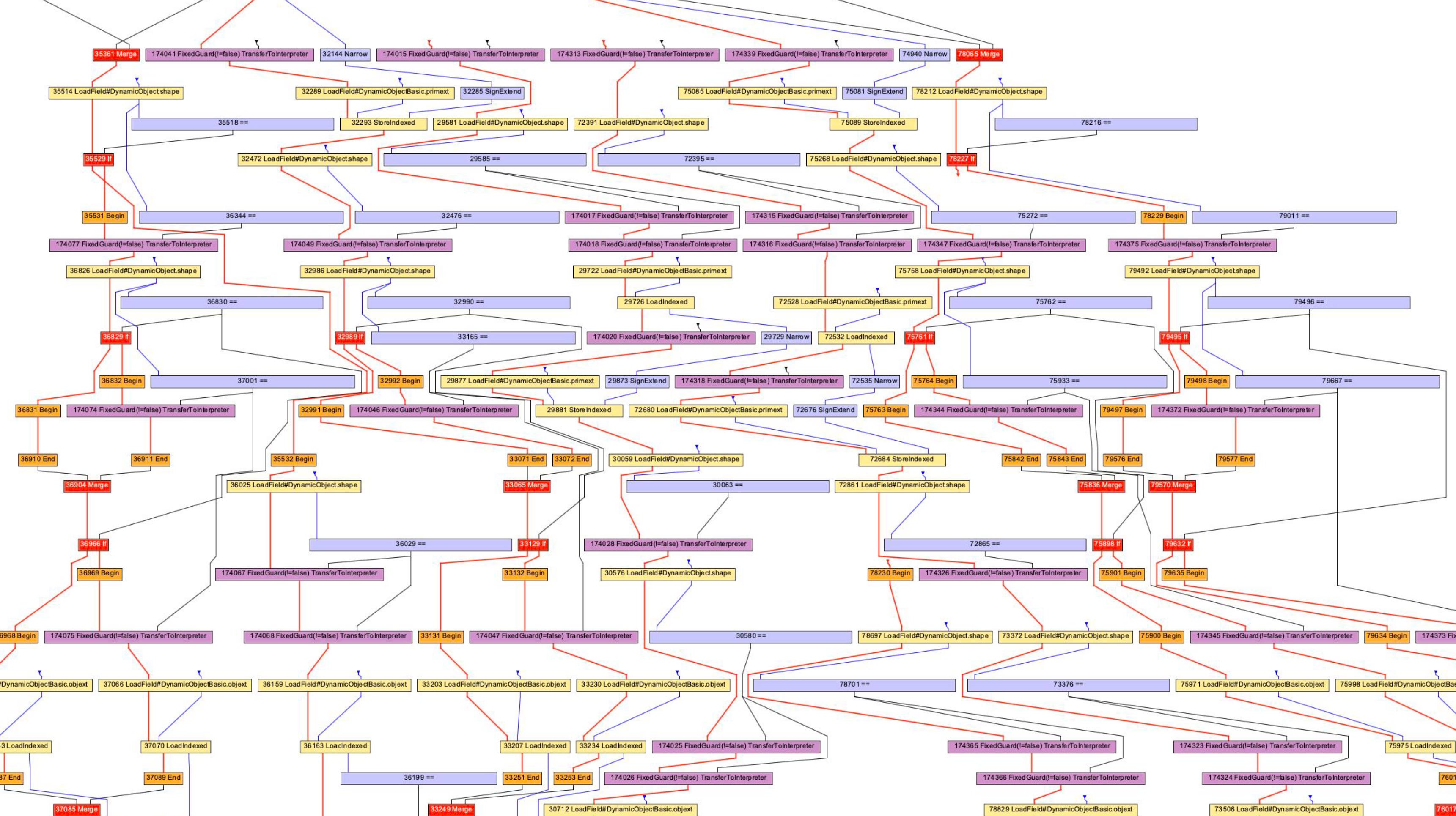 This of course, looks much simpler. Red is control flow, blue is water data flow, and arrows are directions. Note that the fact that this graph appears simpler than the AST from V8, does not indicate that Graal has better simplified the program. Rather, this graph is generated from Java which is much less dynamic. The same Graal graph generated from Ruby would closer resemble that first photo of the graph.