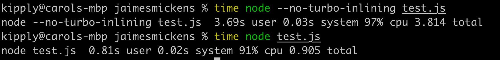 So V8 will compile foo and determine it is inline-able and inlines it with with OSR. However, it only performs this inlining for the code within the loop because it's the hot path and the last line doesn't really exist to the interpreter when this inlining is performed. Thus, V8 still does not have enough type feedback on the function foo because it isn’t actually used in the loop -- the inlined version is. If I --no-use-osr, then the deoptimization doesn’t happen - whether I pass a literal or i. Yet without the inlining, even a measly million iterations are noticeably slower. JITs really embody "there are no solutions, only tradeoffs". Deoptimizations are expensive but not nearly as much as the cost of method lookup and inlining is much preferred in this case.