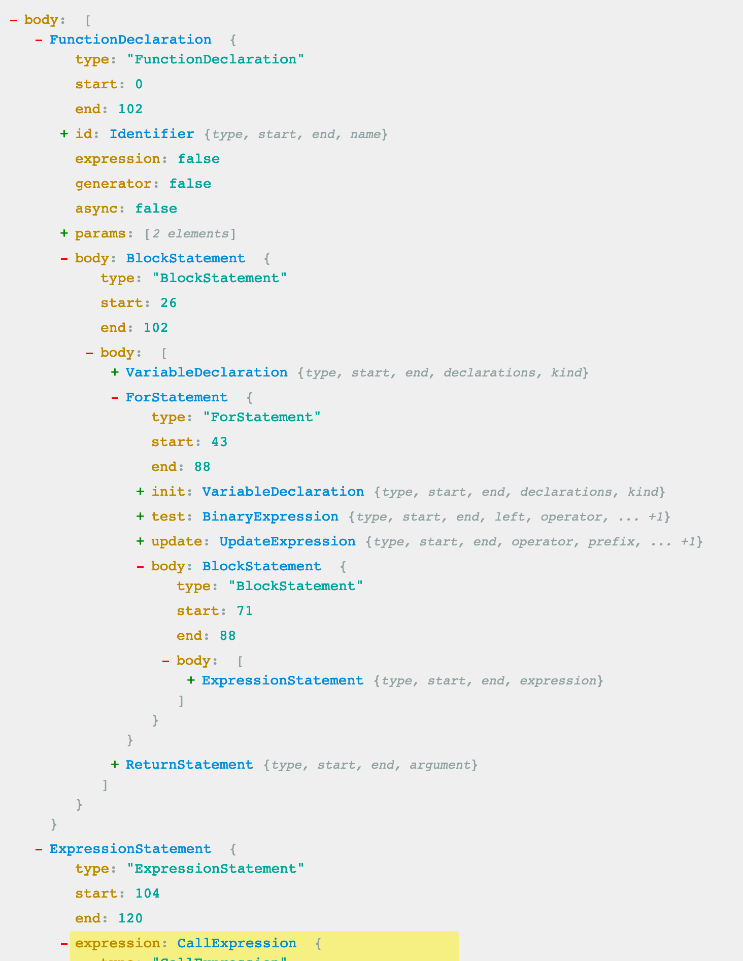 A distinct difference is the variable declarations. In the parser-AST, no actual declaration is explicit for the parameters, and the declaration for the loop is tucked away under the ForStatement node. In the compiler-level AST, all declarations are grouped, along with addresses and metadata.