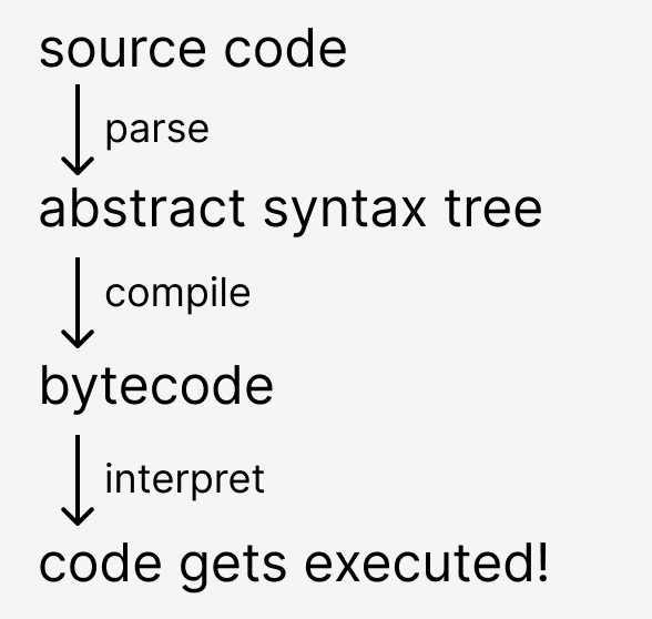 Python and Ruby also execute in two steps. Despite being known as interpreted languages, their reference implementations actually compile the source down to a bytecode. You may have seen .pyc files (not anymore in Python3, they're better hidden) which contain Python bytecode!