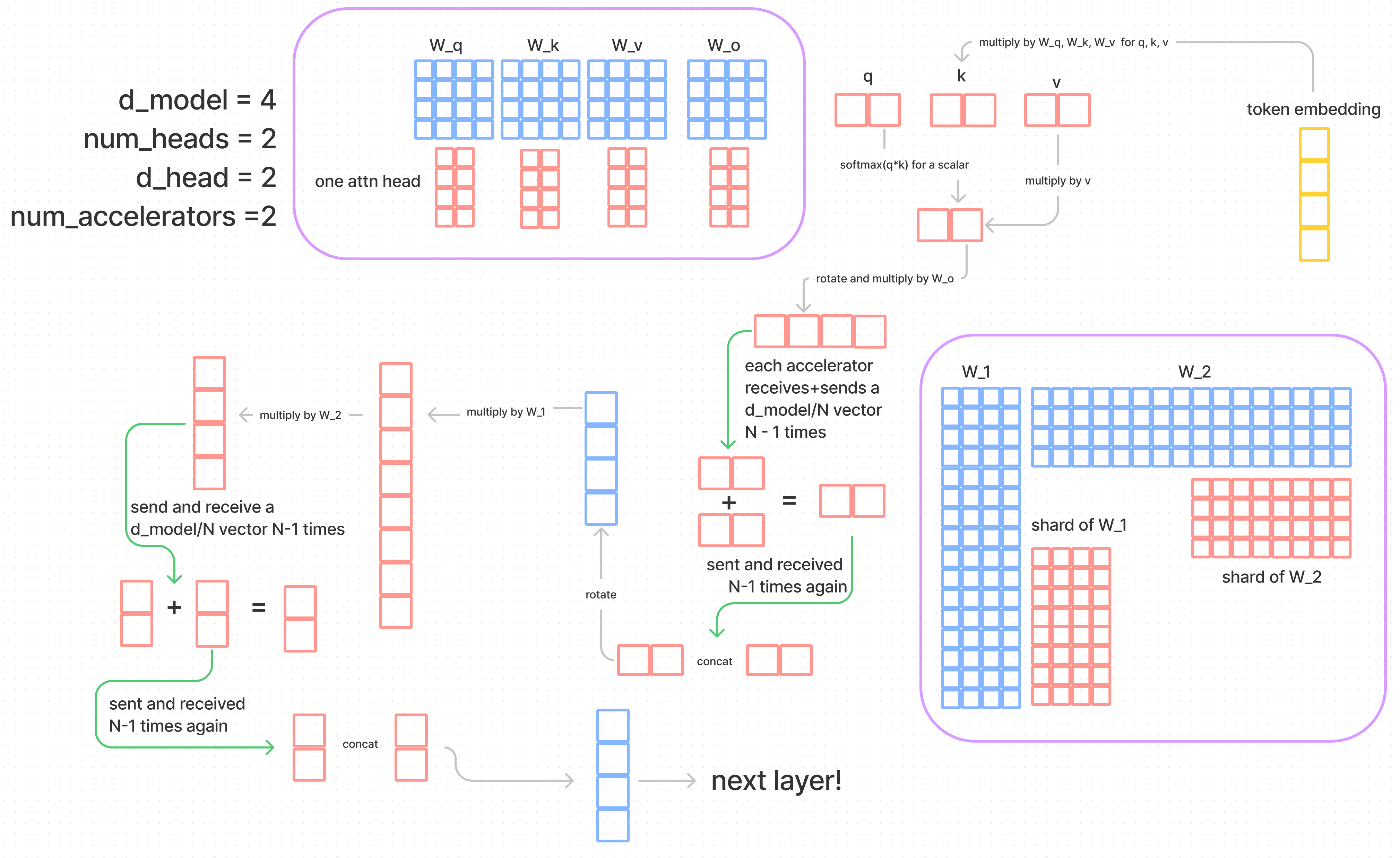 For attention the parallelism is intuitive from the fact that we have multiple heads. We go through most of the attention layer without communication because our attention heads are concatenated to multiply by Wo. After we multiply by v, we multiply the result by our shard of Wo to get a shard of os∈Rdmodel×nheads/N. Then each accelerator will communicate its own shard to all the others, and all the others will communicate their shards back. This is (N−1)dmodel/N of comms cost. Each accelerator will do an even share of the addition to get the output projection, then do the same communication they did last time and the individual hosts will do the concatenation (approximately instant).