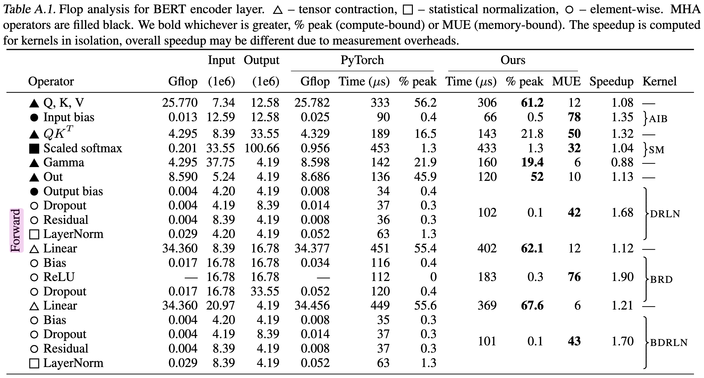 Data Movement Is All You Need (which is mostly about optimising low level data movement for transformers, and isn't a particularly relevant read) has a nice way of classifying operations. We have tensor contractions, which are the big matmuls we've mostly cared about (including the linear layers). Then there are statistical normalisations, the softmax and layernorm. Finally, which this post has completely ignored till now are element-wise operators, which are things like biases, dropouts and activations.
