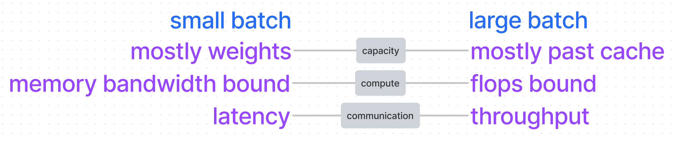 To calculate when the capacity goes from mostly kv cache to mostly weights is trivial, and also isn't a binary in the same way (nothing special happens when your kv cache starts taking up more memory than your weights). Nothing special really happens with comms either. At some point in increasing the batch size, the throughput starts dwarfing the latency so we dropped that factor. As observed previously, the latency becomes insignificant much later (our 512 batch on 52B communication cost was still 11% latency).